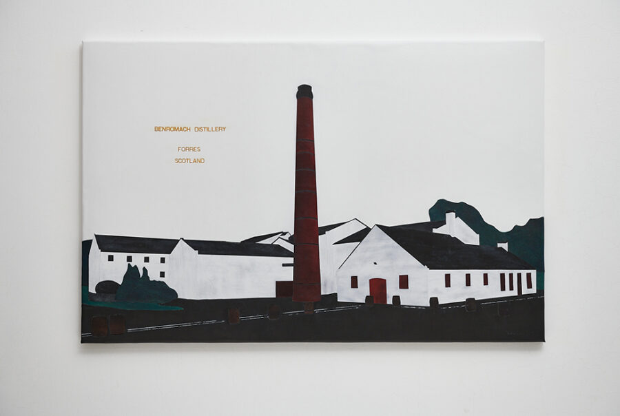 Après un voyage d’inspiration de quelques jours sur place, à découvrir la fabrication du whisky et rencontrer les équipes, sa proposition a pris forme : une œuvre murale en marqueterie de cuir, reproduisant de façon stylisée une photo de la distillerie, permettant ainsi d’utiliser les restes de cuir du projet d’étiquettes de bagages.